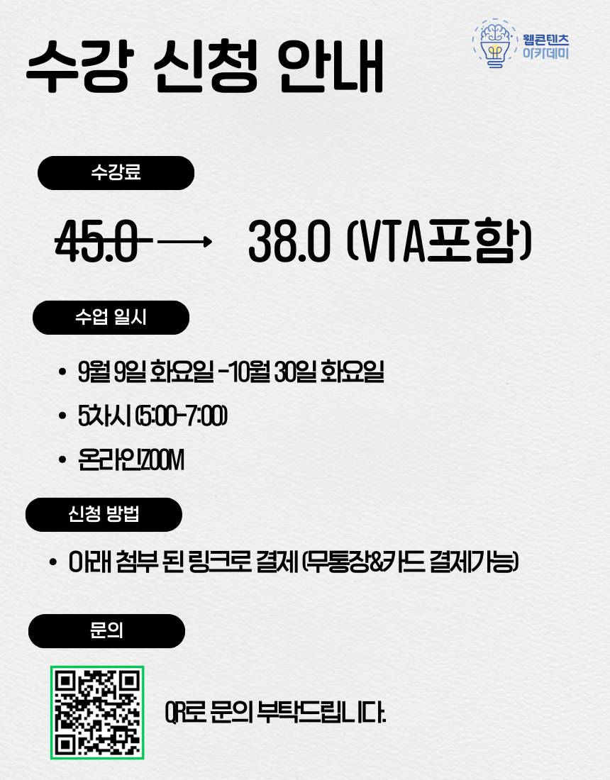 4. 온라인 실시간 강의로 진행이 되며, 수업의 녹화는 불가능합니다.